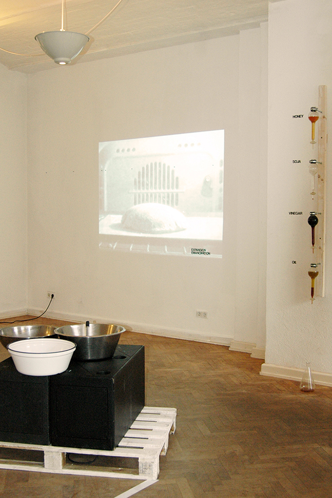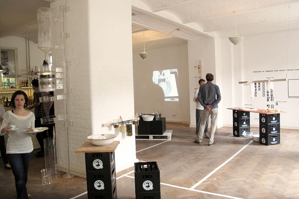 The installation is set like an experimental food lab, where gestures and captation tools were activated in order to express the poetic and plastic measure of fermentation process. Experiments took place on several fermentation processes (lactic, alcoholic, vinegar, sourdough) and were set in space thanks to several types of media (recorded sound of food, filming the action, taking pictures).